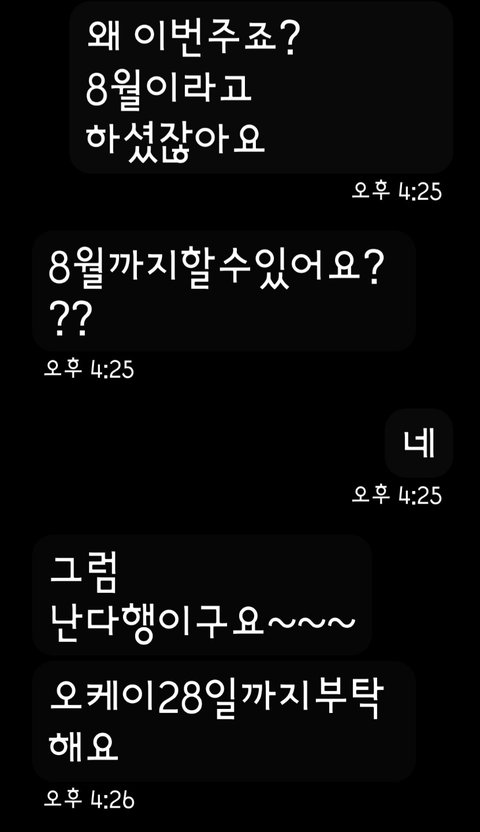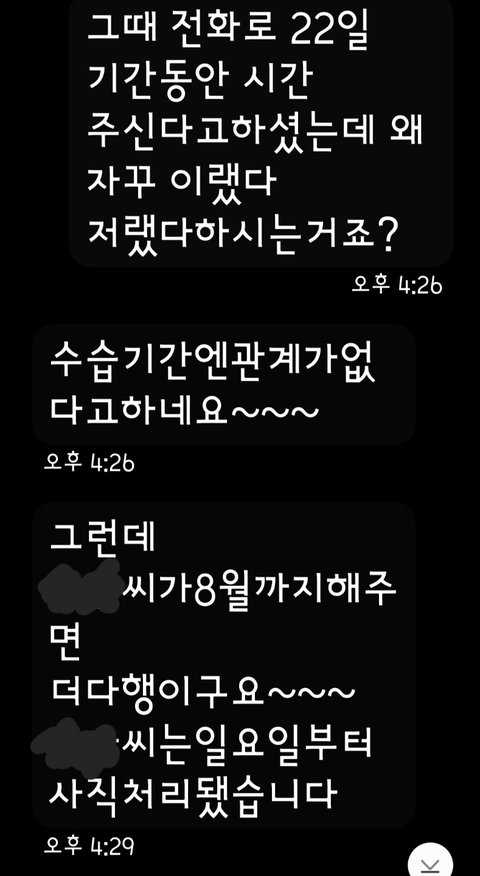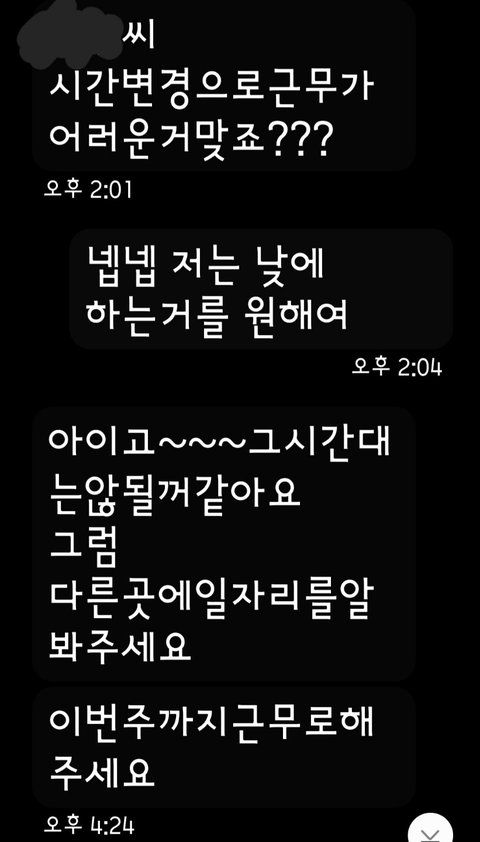 저렇게 문자로 연락하다가 점장님께 통화로 이야기를 하자고 하셔서 시간 조정 이유 등을 듣게 되었습니다. 먼저 시간을 바꿀려는 이유가 본인 가족 중 한 분이 본인 매장에서 일을 할려고 해서 본인 가족이 일 할 시간을 만들기 위해 시간을 조정하는 과정에서 본인이 제시한 시간이랑 알바생이 원하는 시간이랑 안 맞으면 퇴사 처리를 한다고 하셨습니다. 그러면서 알바를 해고하기 22일 전에 알바생에게 이야기하면 법적으로 문제가 안 생긴다고 하셨습니다. 그렇게 이야기하다가 결론은 본인이 제시하는 시간대와 제가 원하는 시간대가 안 맞으니 8월말까지 하고 그만 둬 달라는거 였습니다. 그러고 몇일 뒤에 다시 문자가 왔습니다.