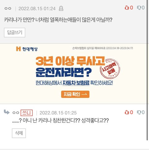 내가 카리나가 성격이 너무 착해서 악플러들이 만만하게 보고 까는것같다고 올렸는데 나한테 열폭하지 말래....ㅈㄴ 진짜 걍 언그을 안할려고 칭찬해줘도 열등감이래 도대체 내가 왜 카리나한테 열등감을 가짐...? 갑자기?? 이해가 안가..열등감이란 뜻은 아나....각자 잘하는ㄱ 있는거지 카리나는 아이돌로서 잘살고 나는 일반인으로서 걍 공부 열심히하고 그런건데 갑자기 열등감....난 아이돌 시켜줘도 소심해서 못해...왜저래 진짜...내가 바라는 삶도 아닌디...