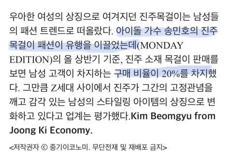 “송민호의 진주 목걸이 패션이 유행을 이끌었는데 의 올 상반기 기준, 진주 소재 목걸이 판매를 보면 남성 고객이 차지하는 구매 비율이 20%를 차지했다”