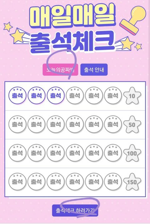 어플 들어가서 아래 [별 모으기] 클릭 한 후 [출석] 눌러주면 돼