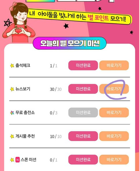 [뉴스보기 바로 가기] 클릭 후 보이는 아무 뉴스 클릭하고 아래로 내려서 1[받기] 클릭한 다음 2 [다음 뉴스] 클릭해서 똑같이 스크롤 아래로 내려서 받기 클릭 다음 뉴스 보기 이거 미션 완료때까지 하면 돼