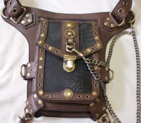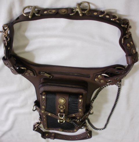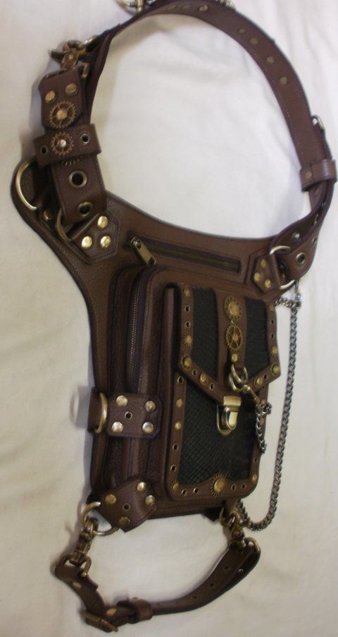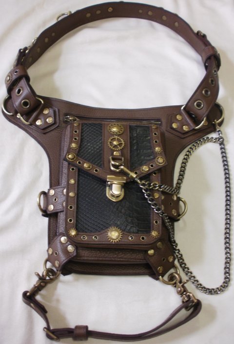 브라운톤의 가죽과 스네이크 엠보싱 가죽을 콜라보하고 엔틱 도금 금속 지퍼,소품 기어 및 기타 콘초 리벳,후크,링 등으로 장식하여 제작한 스팀펑크 챕벨트(벨트백)입니다.(마디샤