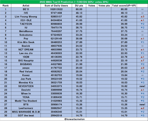 지금 멜.론 성적 누적 순윈데 이게 아직 집계기간이 많이 남아서 충분히 10위권으로 올릴수있다! 그런데 지금 애들이 해투가고 공백기라 점점 화력이 낮아지고있어ㅠ 지금까지 멜.뮤 탑10 상은 음원성적이 낮아서 못갔는데 이번에 누적치를 지금처럼만 유지하면 받을수있는 가능성이 있다고해