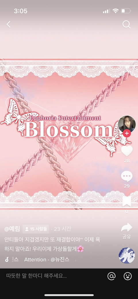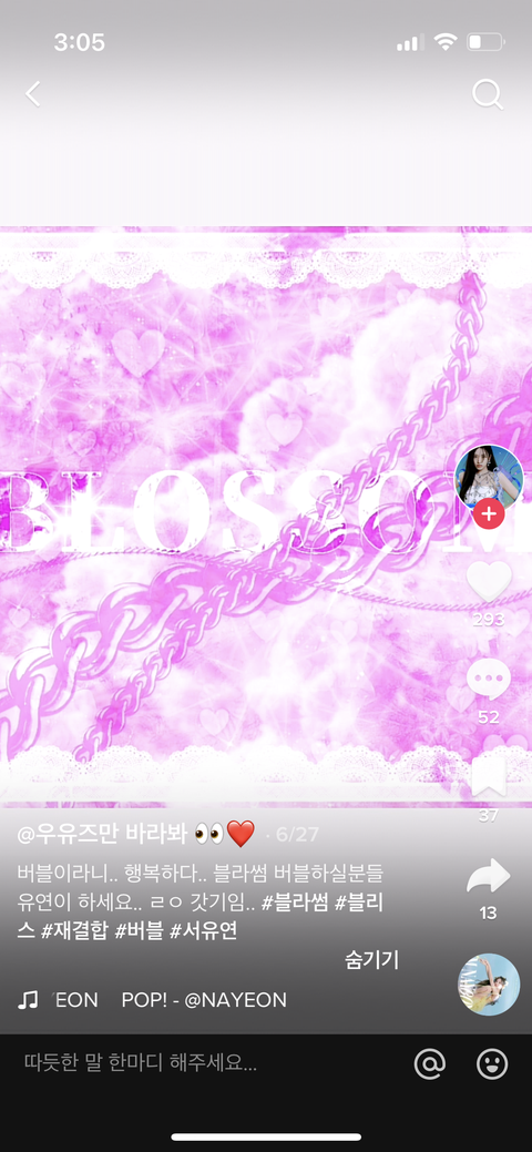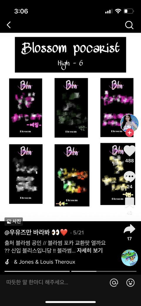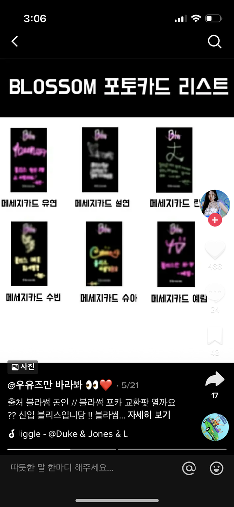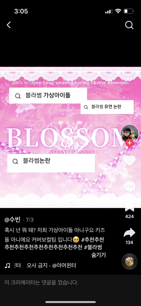 가상아이돌 블라썸 앎? 예전에는 가상아이돌이라고 했다가 욕 오지게 먹으니까 커버보컬 팀이라고 하는 웃긴 곳임 블라썸 중에 유연인가? 걔가 젤 웃김 인성도 개더럽고 뭐 믿고 나대는지 모르겠다 근데 커버보컬 팀이라면서 포카 만드는 건 뭔 논리인지 모르겟음 ㅠㅠㅠ 제발 틱톡에 얘 좀 사라지게 만들어 주라 얘네 재데뷔? 그거 한 3~4번한듯 틱톡에 블라썸 치면 걔네 공식 계정?ㅋㅋ 나올거임 제발 댓으로 뭐라해줘