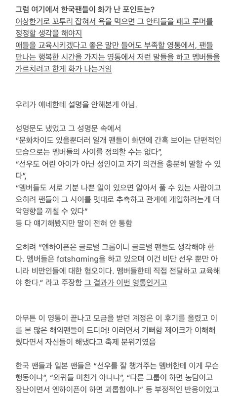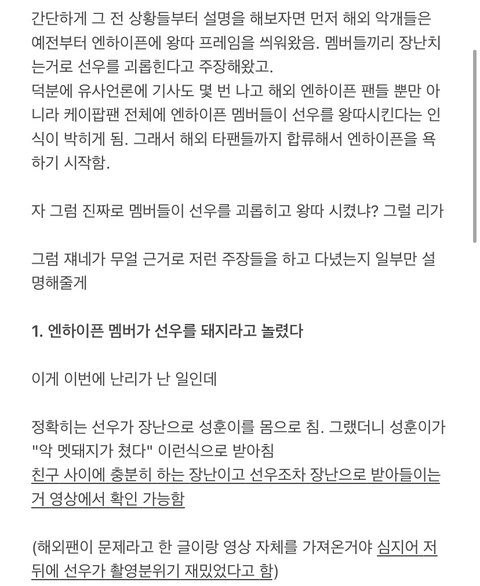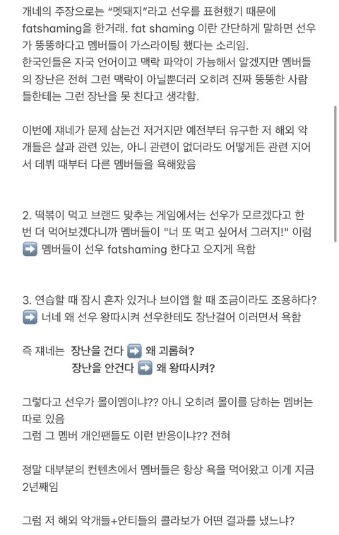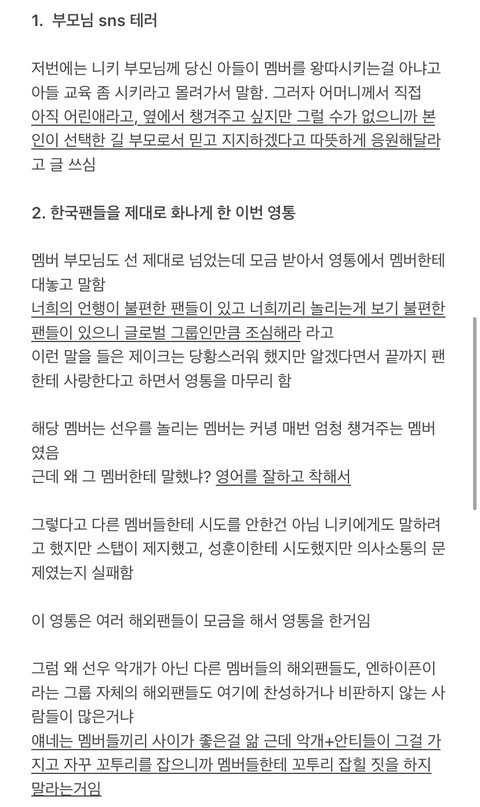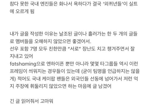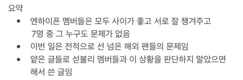 한번 읽고 어떻게 하는 게 좋을지 의견 받을게 자세한 내용을 모르면 오해가 생길 수 있으니까 엔터에 올리지 말자고 했던 거고 악개 옹호가 아니었어 또 타팬이 개입될 수 있는 엔터톡은 논점에서 벗어나 멤버 비난으로 이어질까 봐 조심스러웠던 거고 아래 글 읽어보고 어떤 방향으로 일을 해결 할지 얘기 나누자