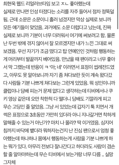 일단 담배는 성인이니까 할 수 있다고 생각함 애가 뭘하든 자기 사생활이니까 우리가 관섭할 수 없음 물론 올라온게 다 사실이 아닐수도 있고 근데 인성폭로, 술자리 합석 그리고 연예인이면 사생활 좀 가리고 다니지 않나 사람들 다 있는 클럽가서 담배피고 어떤 여자 데리고 나가고 원래 연예인들은 어디 가더라도 카페, 식당 이런곳만 올라왔었지 클럽은 처음임..ㅋㅋㅋ 애초에 이미지 안 좋다는 얘기도 나왔고, 바닥에 침 뱉은것도 연예인이 할 짓은 아니라고 생각함 그냥 욕할려는건 아니로 저거 가지고 쉴드치는 애들 있을까봐 올리는거 절대 막 욕하고 비난하고 이런거 아님 오해ㄴㄴ