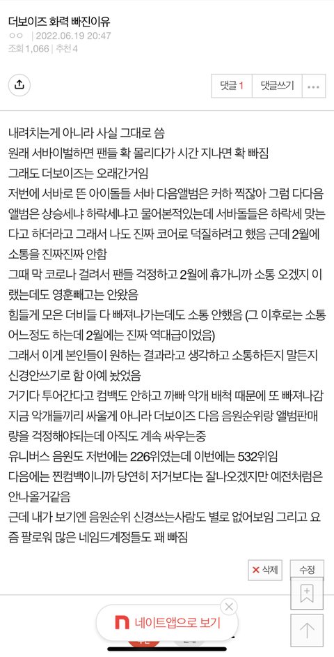 더보이즈 팬들 ㄹㅇ 이상한게 이번 컴백 보면 회사 일처리가 제일 이상한데 왜 멤버 탓을 하지? 난 오히려 이번 콘서트때 멤버들이 진심으로 잘해서 팬덤 으쌰으쌰하는 분위기 생겼다고 생각하는데 여기에 컴백날 소속사가 찬물 뿌렸다고 생각함 컴백 프로모도 3주동안 비어있는 날이 더 많고 퀄리티도 좋은 편 아니었고 앨범 발매 쇼케이스도 안하고 하다못해 기자들 부르는 미디어쇼케도 없었지 지금 기본적인 홍보, 마케팅을 아예 안하고 있잖아ㅋㅋ 내가 봤을땐 합병 후로 회사 내부에 인사이동이든 뭐든 뭔 일 있어보이고 그 뒤숭숭한 분위기 가장 잘 느끼는 사람도 더보이즈 멤버들일걸