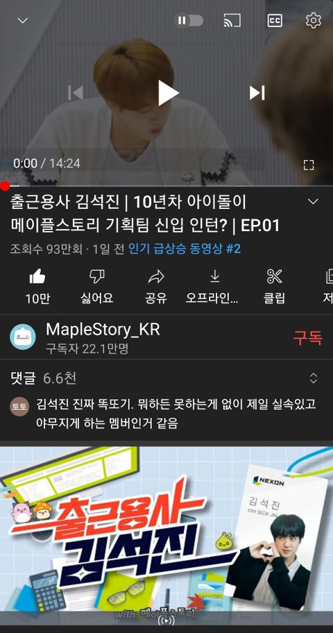 어제 출근용사 김석진 유튭 올라올 시간에 하이브 유치하게 방해까지 하던데 인동 2위네 ㅎㅌㅇ
