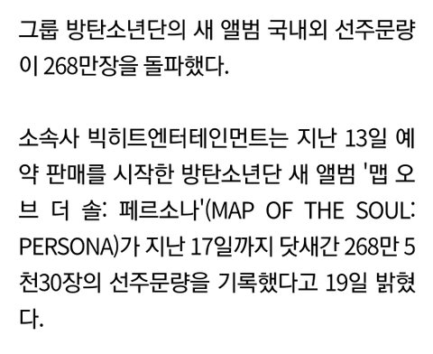 페르소나 (2019) 앨범은 5일만에 268만장 돌파,