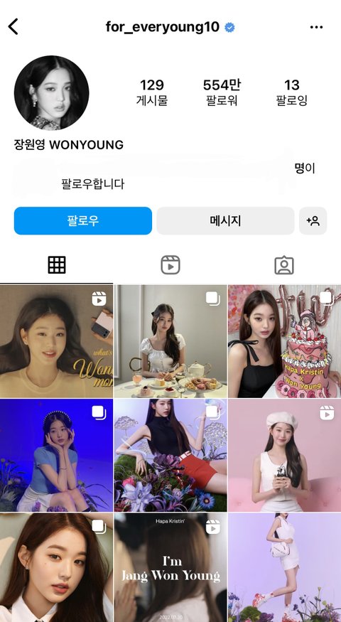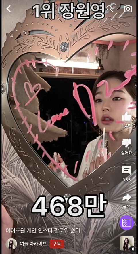 다른 멤들은 다 100,200만댄데 혼자 400만대라 오진다 하면서 인스타 가봤더니 550만대네… 2개월 전 영상이던데 그럼 2개월동안 86만명 는건데 장원영 뭐 어디 유명 프로그램에 나옴? 미쳤다