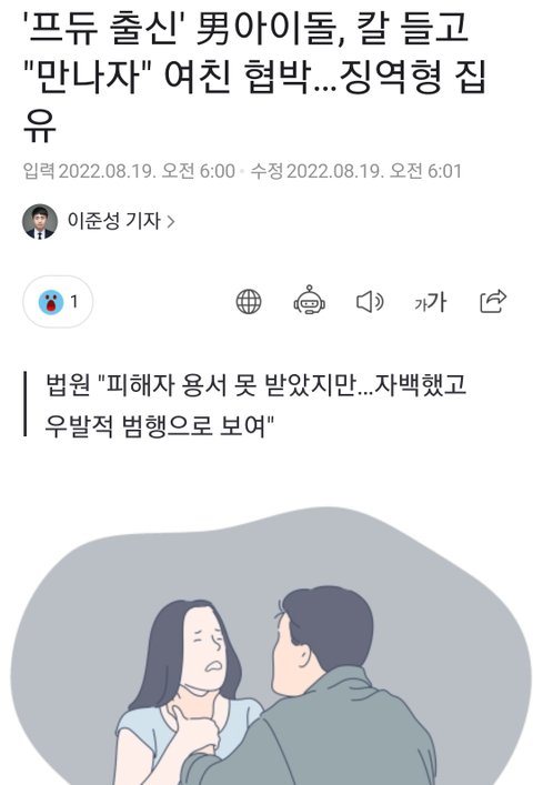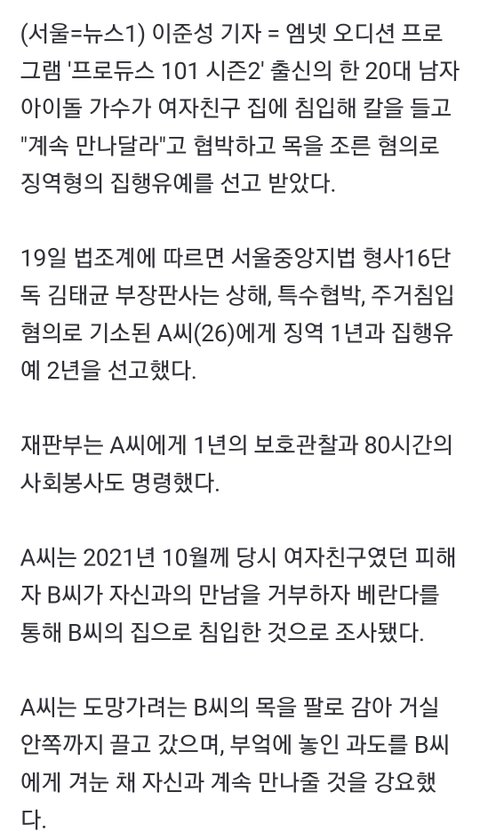 '프듀 출신' 男아이돌, 칼 들고 "만나자" 여친 협박…징역형 집유