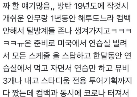 ㄹㅇ 19년도에 작것시내고 왜 안무 쉬운거 내냐고 탈방계, 까빠련들 하루종일 까질해서 on 때 이악물고 안무연습해서 냈더니 코로나터짐 ㅅㅂ 이때 보면 진짜 멤버들 멘탈 다 약해진거 티나서 눈물났어 하