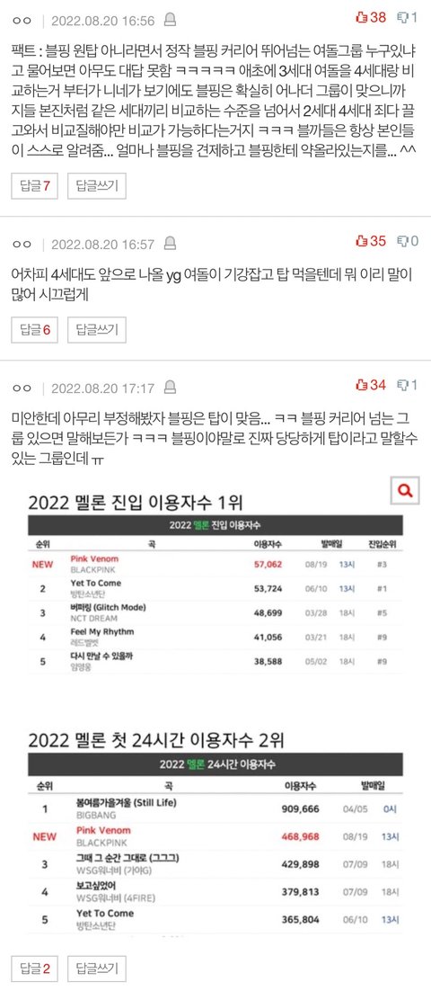 그래봤자 탑은 블핑이라는걸 이미 대중들이 말해주고 있잖아... 팩트를 한번 봐봐 블까들 눈물나게 정리해놓은 팩트 ^^