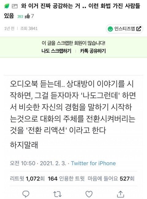 예를 들어서 나 이 립스틱 샀다 하고 말했는데 친구가 오 나도 그거 집에 있어 어쩌고저쩌고 이러면서 자연스럽게 자기 얘기로 이끄는 거..