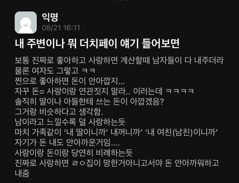 무조건 좋아하면 돈을 막 쓴다 이런게 아니고 돈을 써도 내 여자친구한테 쓴거니까 기분이 안나쁘다 이거야.. 기분 나쁘면 돈 아까운거고 ㅋㅋㅋ 덜 사랑하는거고..ㅋㅌㅋㅋㅋ그러니까 더치페이 하지고 하는거겠지