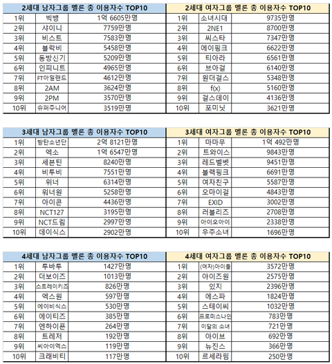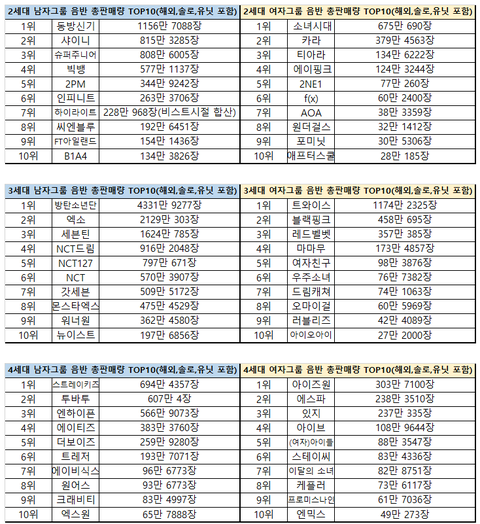방탄소년단 엑소 샤이니 빅뱅 소녀시대 트와이스 블랙핑크 레드벨벳 에스파 투바투 스키즈 더보이즈 이달의 소녀 스테이씨 아이브 뉴진스 르세라핌 크래비티 엔하이픈 에이비식스 에이티즈 위너 비투비 아이콘 엑스원 트레저 있지 아이즈원 뉴이스트 마마무 러블리즈 오마이걸 데이식스 슈퍼주니어 엔시티 엔드림 티아라 에이핑크 투애니원 씨스타 원더걸스 아이콘 비스트 인피니트 동방신기 프로미스나인 케플러 엔믹스