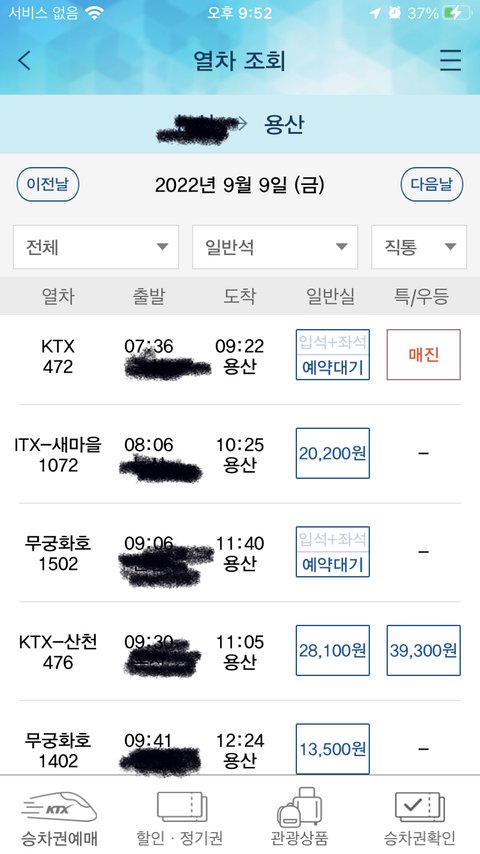 막 예매하기 어렵다 이러는데 나는 우리지역에서 용산 가는 거 9일날 검색하면 이렇게 뜨는데 그냥 이거 예매하면 되는거지?ㅠㅠ