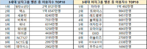 3세대 걸그룹 멜론 이용자수도 트레블중 꼴찌