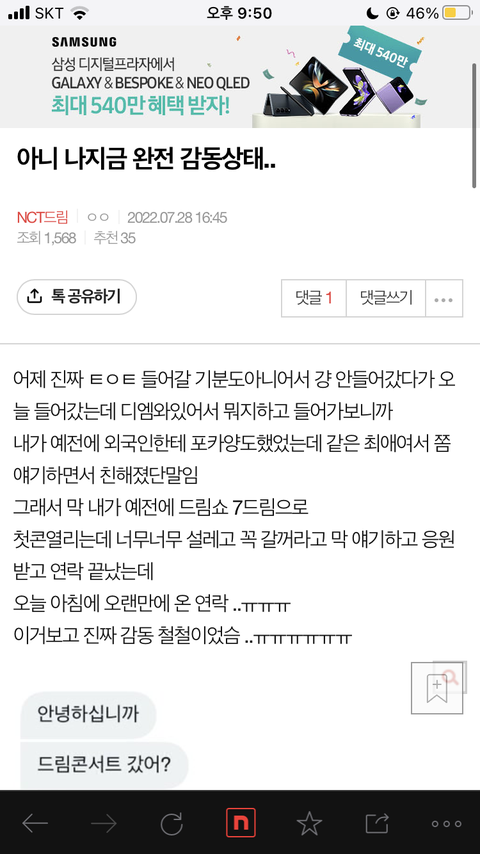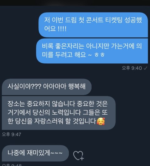 이때 포카 교환한 외국팬분이 전에 드림쇼 취소된거 아시고 연락주셔서 너무 감동받았다했던 쓰닌데 오늘 선예매로 좌석 잡자마자 바로 생각나서 연락드렸더니 나보다 더 기뻐해주셔서 너무 감사함 .. 진짜 인류애충전 굿굿 ..