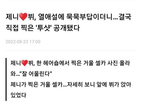 이 사진 한장만 봐도 제니가 뷔 엄청 좋아하는걸 알수있음 제니가 먼저 뷔 쫒아다닌건데 뷔를 무슨 선배 여친뺏은 나쁜놈으로 몰아갔냐