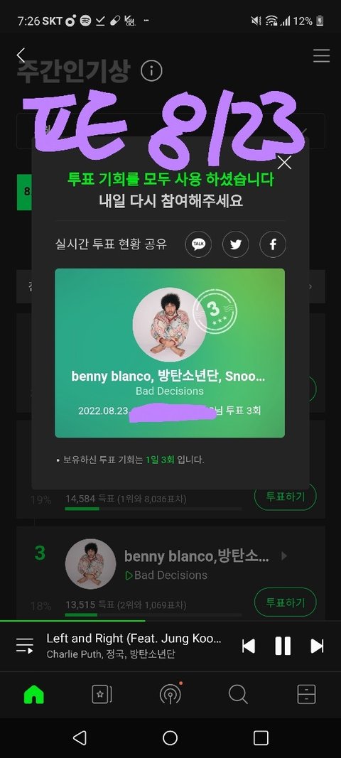 이거 매일해주라 이용권결제 안해도 아이디만 있으면 투표할 수 있어 요거 1위 몬해도 포기하지말고 계속 해야하는게 한표한표 누적되어서 멜뮤 탑텐 뽑고 심사에 도움됨 혹시나 모를까봐 말해봄ㅋㅋ 다들 ㅎㅇㅌ