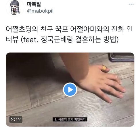 마복필님이 올려준건데 방린이가 정국이랑 결혼하는 법 알려주는데 진심 개웃겨ㅋㅋㅋㅋㅋㅠㅠㅠㅠㅠ 너 전정국이랑 결혼할꺼야? 이러는데 쓰읍 정국이가 너무 아까운데? 이럼