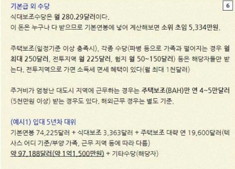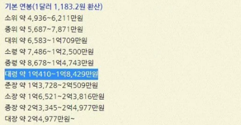 기본급 1억 8천 + 식대보조 440 + 전투 지역 수당 360 + 주택보조 + 소득세 면세 헤택