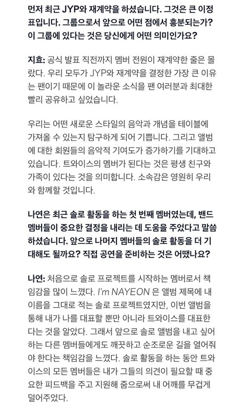 멤버들끼리 미래가 대해서 이야기는 했겠지 재계약 여부를 말을 안한거고 누구는 재계약 했고 누구는 안했고 이런 이야기가 오가면 누군가에겐 부담이 될 수도 있고 강요가 될 수도 있으니까 걍 서로 배려한거지