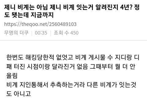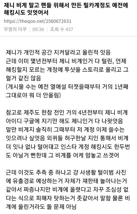 나도 이거 맞말인거 같은게 제니가 멍청이도 아니고 다른계정 몇번 털릴뻔한적 많고 솔직히 지인이 배신할 경우 무시못해서 비계털리면 큰일날거 빼박인 상황에서 저렇게 대놓고 사진 못 올릴것같음 그냥 진짜 다른경로로 털린듯