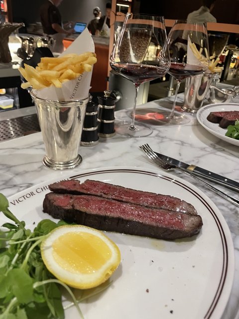 지인과 브런치 먹고 나오면서 옆에 있는 바가 유명한 곳이라고 해서 지인과 같이 고기 썰고 왔어요. 칵테일 새우와 숯불구이 오징어를 화이트 와인과 함께 애피타이저로 먹어서 감자칩은 거의 손을 안 대고 소고기 200그램만 클리어~