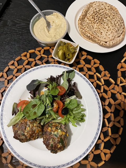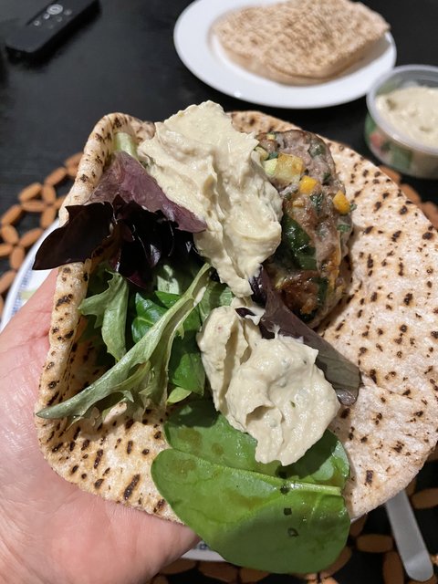 양고기 동그랑땡에 홈므스나 그맄 요거트, 샐러드를 플랱빵에 넣어 쌈 먹듯 먹었어요.