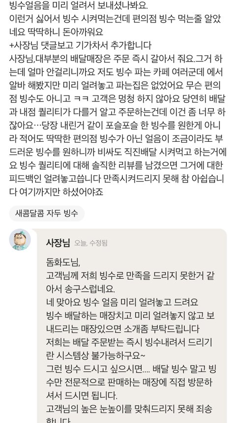 저기 +한거부터가 내가 사장 댓글보고 어이없어서 추가한거임 배달비 포함 16500원짜리 빙수임 ㅋㅋ근데 얼음을 갈아놓고 쓴다는게 문제 아님? 그럼 누가 시켜먹음 편의점 가서 사먹지?