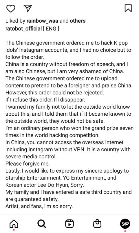 해당 해커는 RATOBOT 이라는 닉네임을 가지고 활동했고, 어제 ( 8월 25일 ) 인스타그램 계정이 약관위반으로 인해 정지됬음. 현재 접속불가.