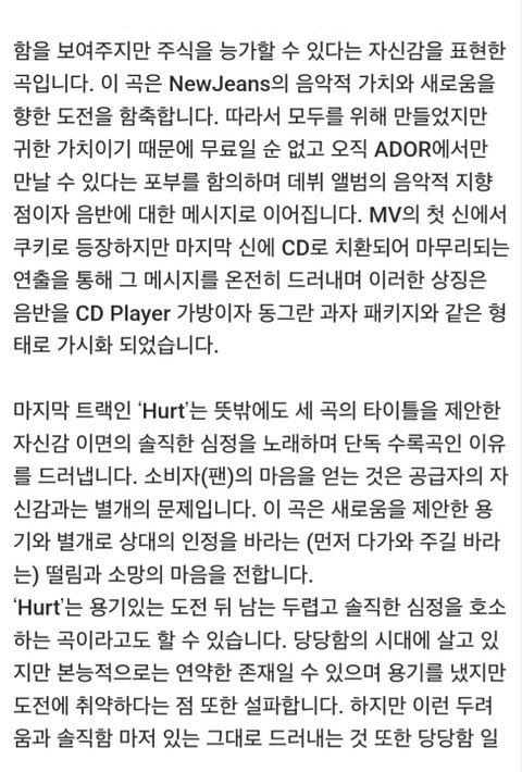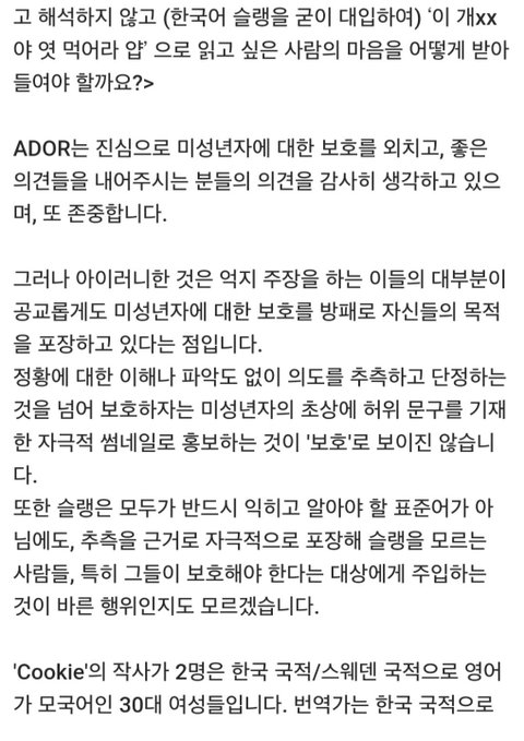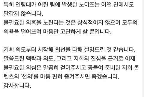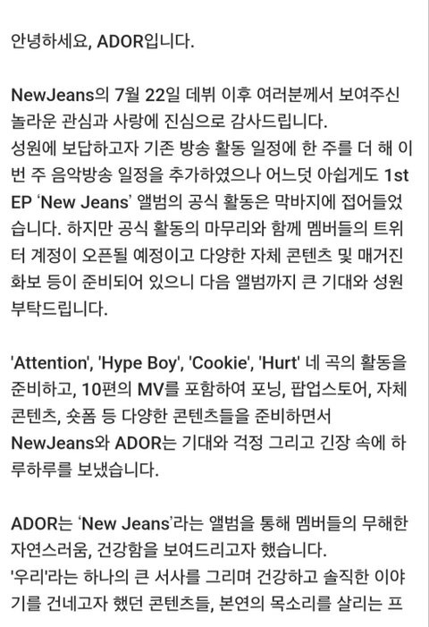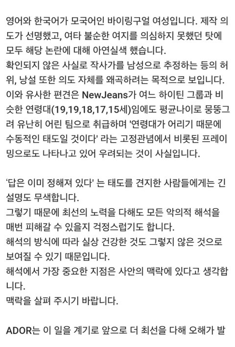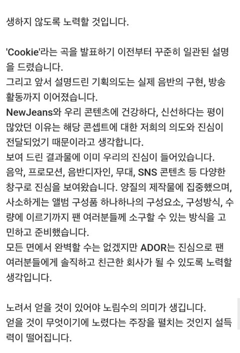 이때까지 돌판 덕질하면서 본 소속사 입장문 중에 제일 깔끔하고 납득이 감. 동시에 해당 논란 자체가 근거가 약하다는걸 증명해주는 것 같음. 입장문 보니까 소속사 입장에서 진짜 속상했겠다.. 해당 논란이 뉴진스라는 팀의 기획의도와 이미지 자체에 정면으로 부딪히는 내용이라...... 다만 이번 논란이 생기는데 소속사 대표인 민희진 대표에 대한 논란이 근거를 만들어주기도 했으니 이 부분도 회사 차원에서 고민 좀 해봤으면 좋겠음.