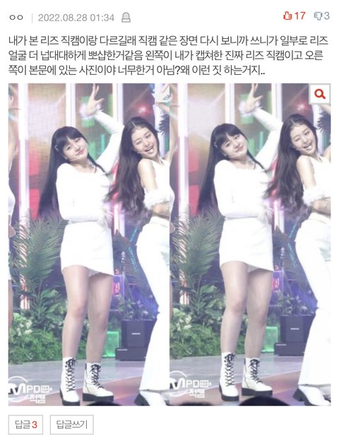 리즈 살쪘다는 프레임 씌우려고 악의적으로 사진 포토샵 조작까지 하는 건 진짜 아니지 않아? 진짜 ㅁㅣㅣㅣㅣㅊㄴ 아니야?