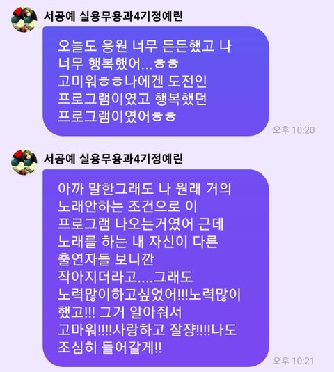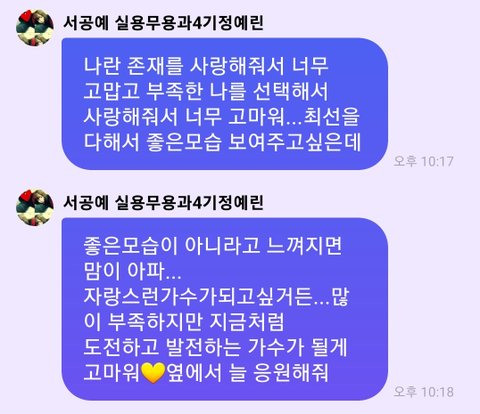 싱인더그린이라는 노래하는 프로그램하면서 느낀건데 솔로 하면서 부댬감, 배우할려고 젤 먼저 딴 회사랑 계약했으면서 노래는 왜 부르냐는 추측성 악플 때문에 자존감 많이 내려간거 같아서 안쓰러움.. 근데 그 와중에 계속 진짜 팬사랑넘쳐서 눈물남 ㅠ