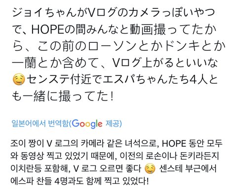 조이 일본 도착한뒤로 며칠 전부터 계속 카메라들고 다녀서 브이로그 나오는거 아니냐고 팬들 궁예했는데 슴콘 엔딩 때도 브이로그 찍은듯