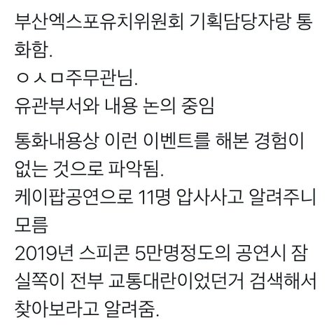 2030부산세계박람회 전화민원(안전문제 숙박문제 및 이 장소가 유치기원이라는 콘서트 목적에 맞는지 등)
