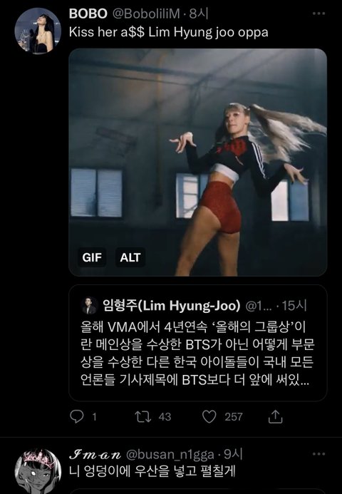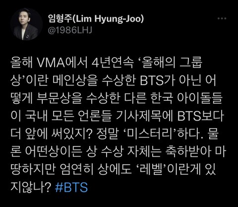 저분 이번 VMA 국내가수 수상 관련해서 트윗남기셨는데 인용보면 80퍼 이상이 리사 동남아팬들임 구구절절 맞는말에 반박은 못하고 그저 울언니 상타니까 부러워서그러냐고 빽빽거리는중…성희롱까지 하는데 진짜 꼴보기싫다