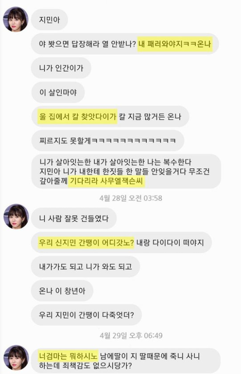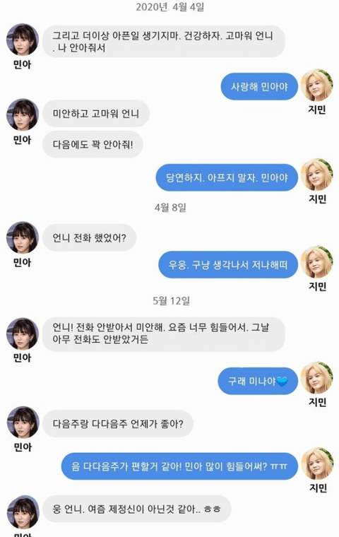 팩트-지민은 민아 챙겨줄거 다 챙겨줬고 리더로서 쓴 소리 한 정도였음 오히려 민아쪽이 지민에게 가한 욕설 수위가 더 심했고 근데 이걸 한쪽 입장만 믿고 가해자 피해자 구분 짓는 대중이 이상한거 지민은 100%마녀사냥임