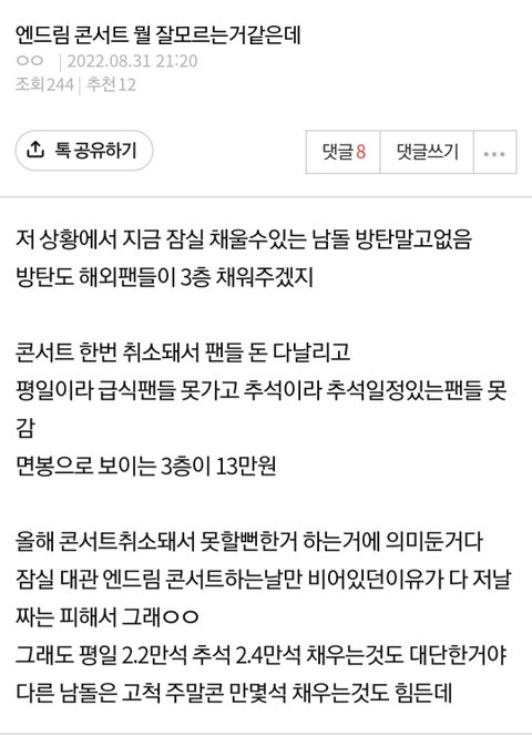 잠실 채운다고 다 떠들고 다녔는데 자리 엄청 남고 2,3층 극싸 막고 3층은 뒷자리도 막으니까 방탄도 3층은 해외팬이 채운거다 최근에 고척한 남돌 세븐틴인데 요 며칠 세븐틴은 고척 간신히 채웠다 저러고 다님ㅋㅋㅋㅋㅋㅋㅋㅋㅋㅋㅋ이 아래 댓글도 엔드림 팬이 방탄 세븐틴 치는 글에 달린 댓글임