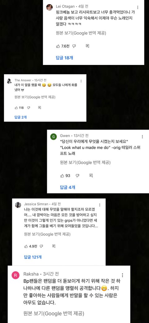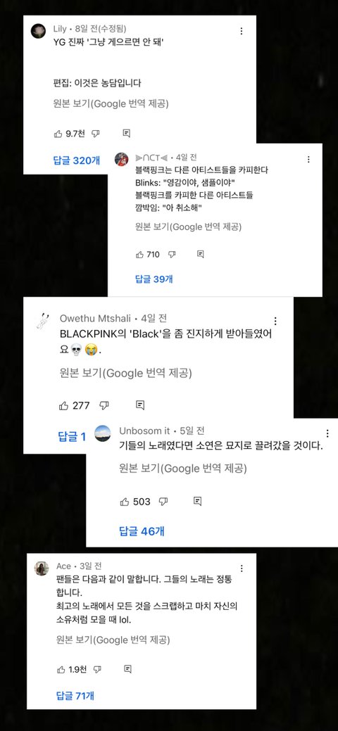 8. 블랙핑크의 블랙이 진짜 블랙이었어 (블랙이 약간 악질, 진상 요런 의미같음 ex. 블랙리스트. 우리나라로 치면 표절핑크, 블랙병크 라고 조롱하는 꼴)