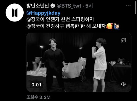 @Happyjkday 라는 사람한테 직멘으로 정국이 생일 축하해준 뷔 (직멘이라 트윗 및 답글 들어가야 보임)
