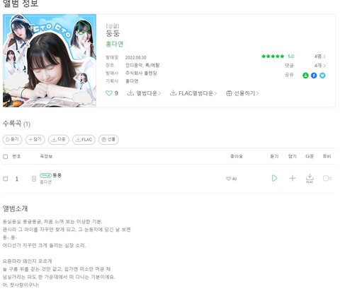 지금은 실용음악과 4학년에 재학중이고 싱글 2집인데 진짜 이 친구 노래중에 역대급으로 노래가 좋아... 가수 이름은 홍다연이고 노래 제목은 둥둥이야!
