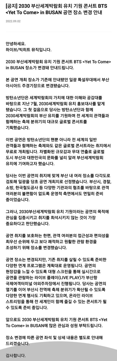 방탄 부산 콘서트 장소 변경됨!!! (공식)