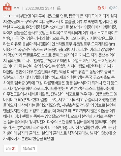 아니 약간 지디 전에는 진짜 범접할수 없는 천재 아티스트 이런 느낌이였는데 지금 뭔가 제니 한테 버림 받은 그냥 늙은 아저씨같음.. 하필 그것도 뷔랑 바로 사겨서 만약 방탄 뷔 제외 다른 멤버들이면 그냥 ㅇㅇ 그렇구나 할텐데 한국에서 제일 인기 많은 그룹에 제일 인기 많은 멤버랑 사겨버리니까... 뭔가 안 쓰러워 보이는 어르신같음