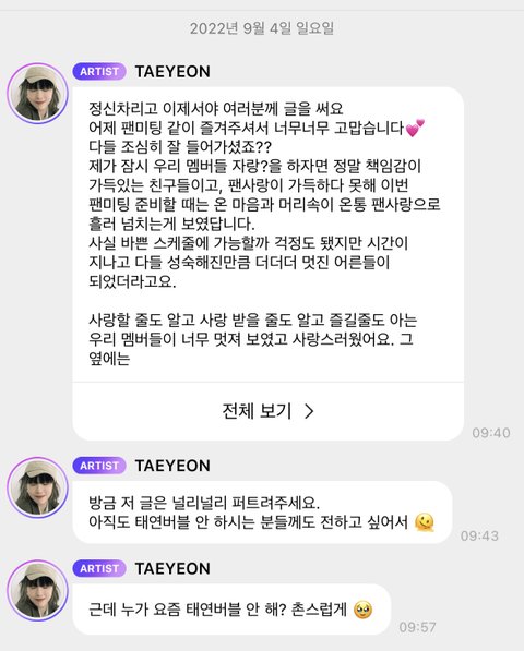 (버블 한 번 보낼때마다 장문으로 편지쓰듯 오는 태연 ㅠㅠ