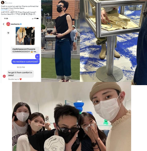 이 목걸이는 이안 참스 거, 블핑 목걸이라고 하더라. 컴포트 서울에서도 팔고 있음. 공식 인스타에서도 GD가 방문했을 때 컴포트 서울한테서 받았다고 확인됨. 지디가 이수혁하고 컴포트 서울에 있었고, 나올 때 목걸이 없었음. 일종의 프로모션임.