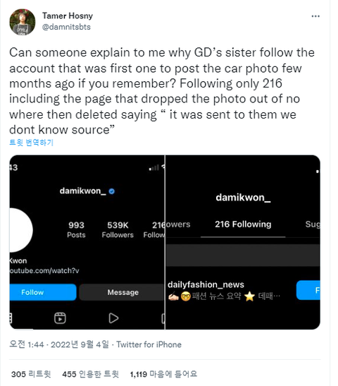 제니하고 뷔 제주 여행사진 유출된 계정을 지디 누나가 팔로하고 있다 하는데 그건 원래 패션 뉴스 계정이고 패션 관심있는 사람들이 팔로우하는 계정임. 지디 누나는 자기 브랜드 있는 디자이너임. 그리고 그 계정은 방탄 스타일리스트도 팔로우하고 있는데 아무도 뭐라고 안함.ㅋㅋ