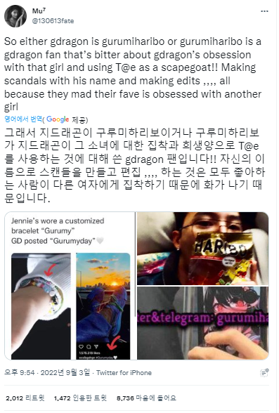 -그리고 제일 어이없는 거는 뷔하고 제니 사진을 유출한 계정이 지디 본인이나 지디 팬이라는 얘기임.ㅋㅋ